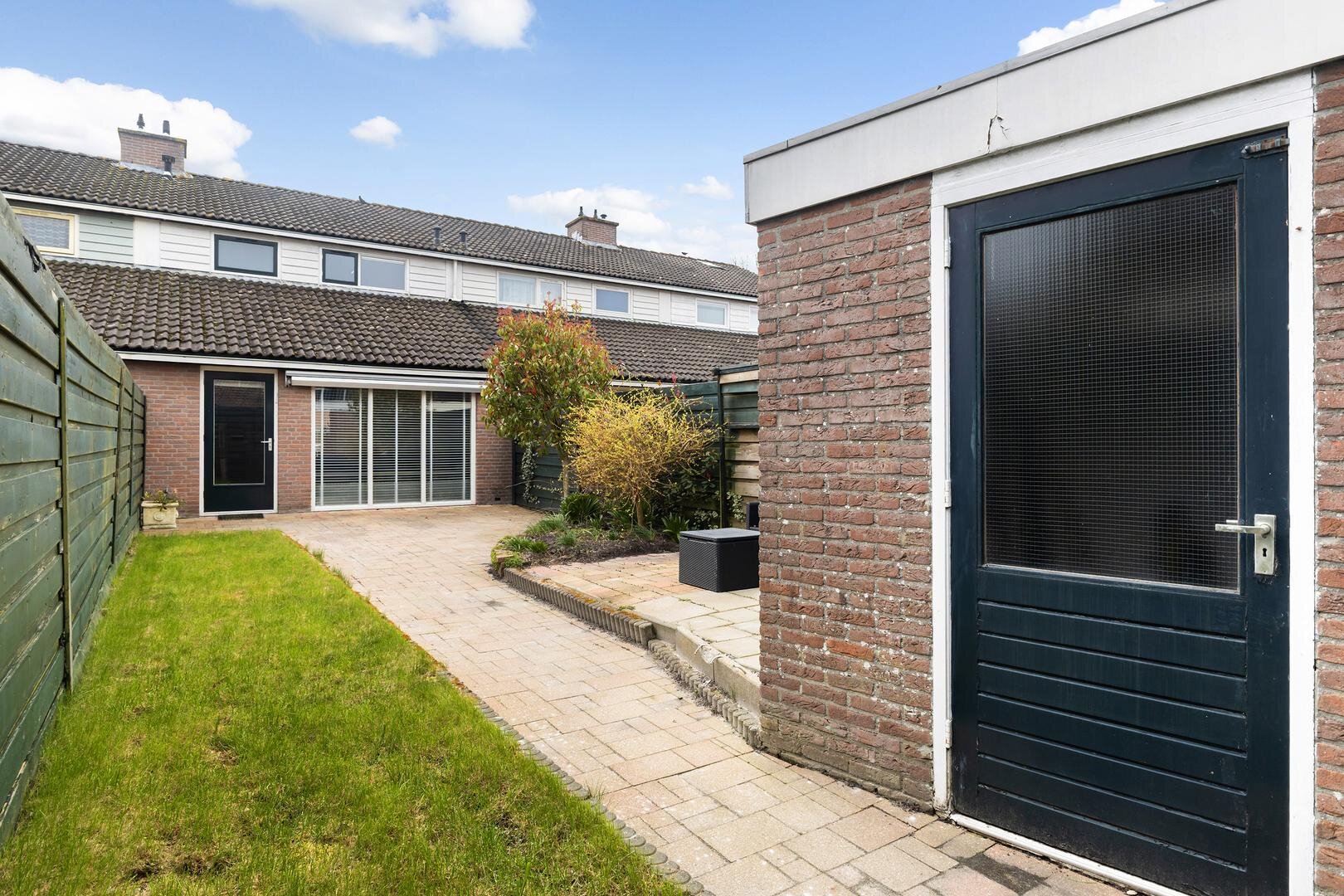 - diepe achtertuin met stenen berging