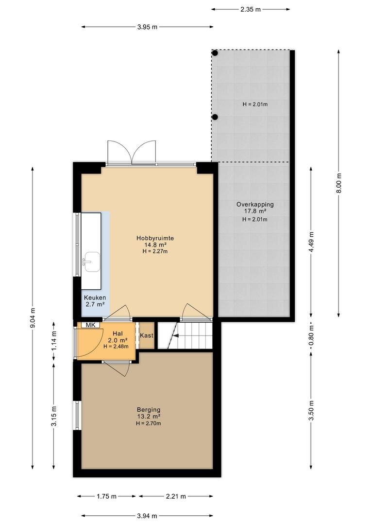 Begane grond: hal, badkamer met douche en toilet, grote slaapkamer met inloopkast, kelder, woonkamer met open keuken en serre.